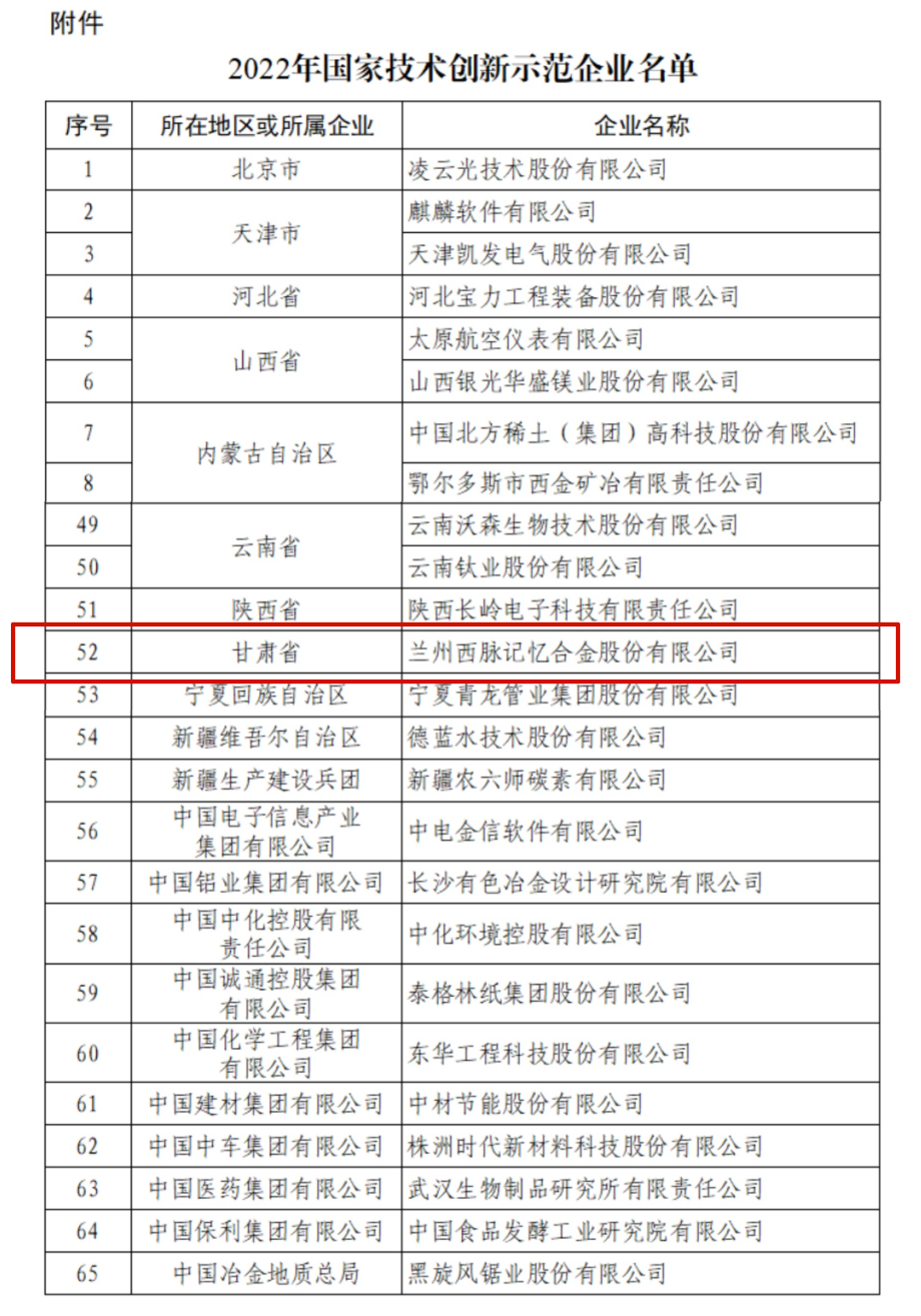 & nbsp; & nbsp; & nbsp; According to the "Management Measures for the Recognition of Technological Innovation Demonstration Enterprises (Trial)" (Ministry of Industry and Information Technology Lianke [2010] No. 540), 65 enterprises have been recognized as national technological innovation demonstration enterprises in 2022 through procedures such as application, review, and publicity by various regions and relevant units& mdash; Gansu Province was selected as a subsidiary of Lanzhou Ximai Memory Alloy Co., Ltd.